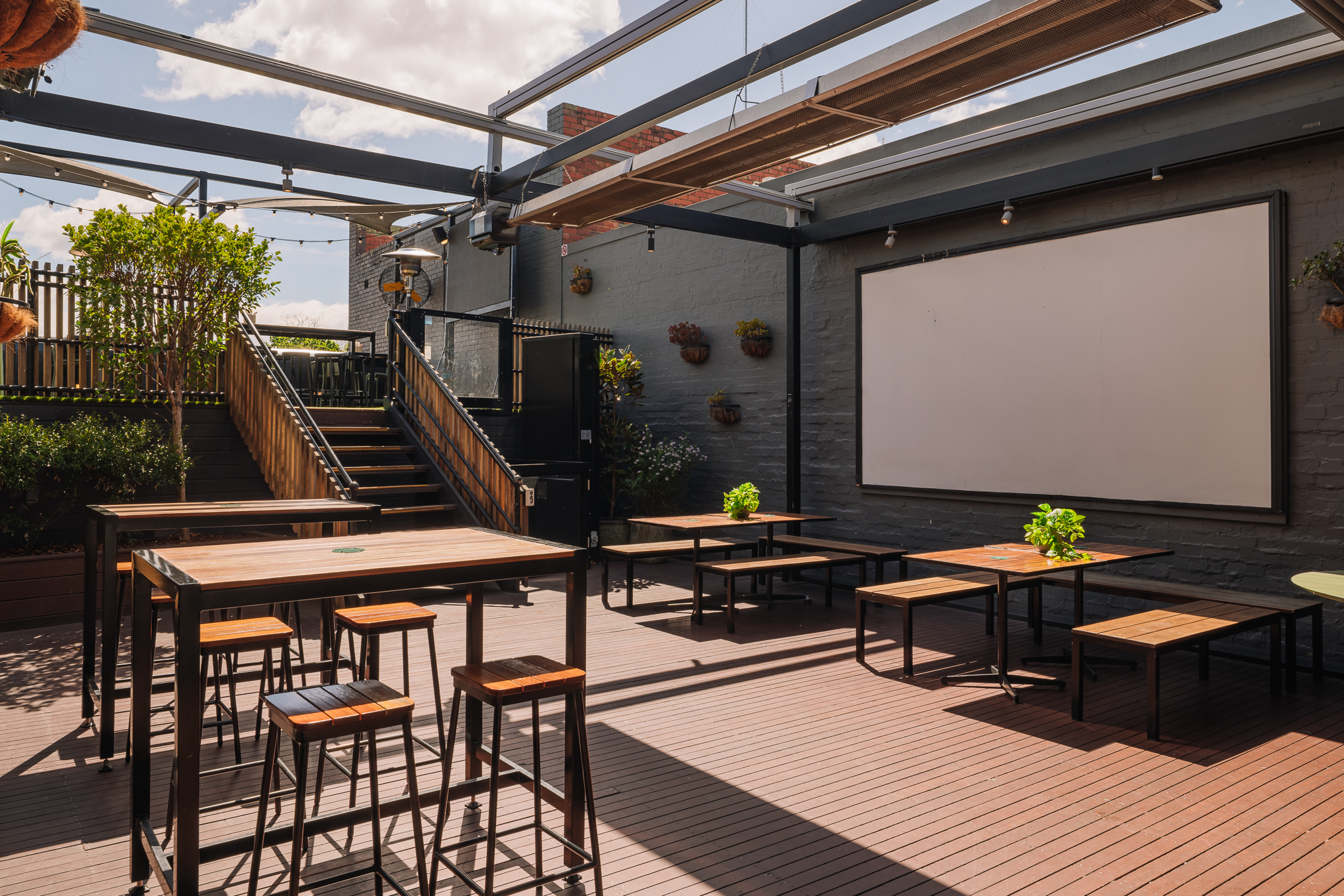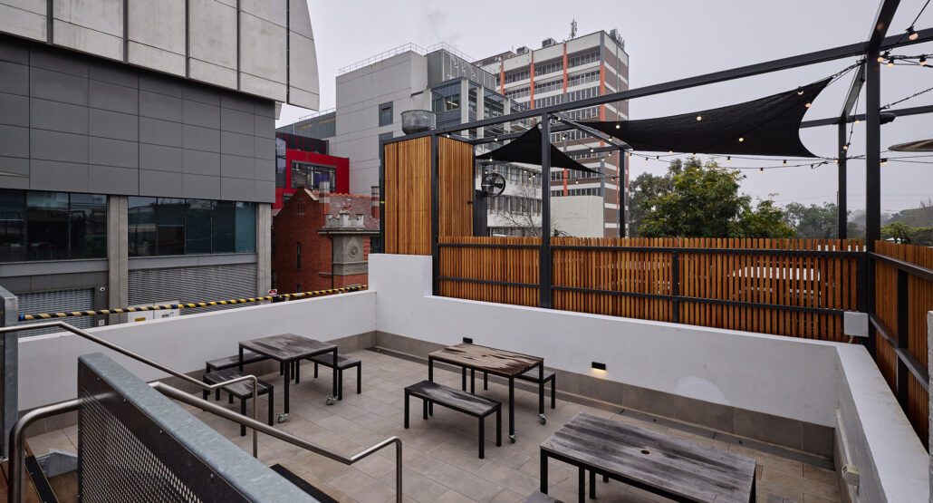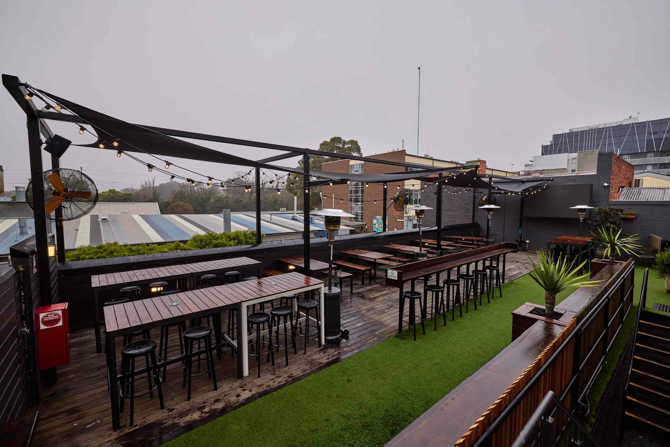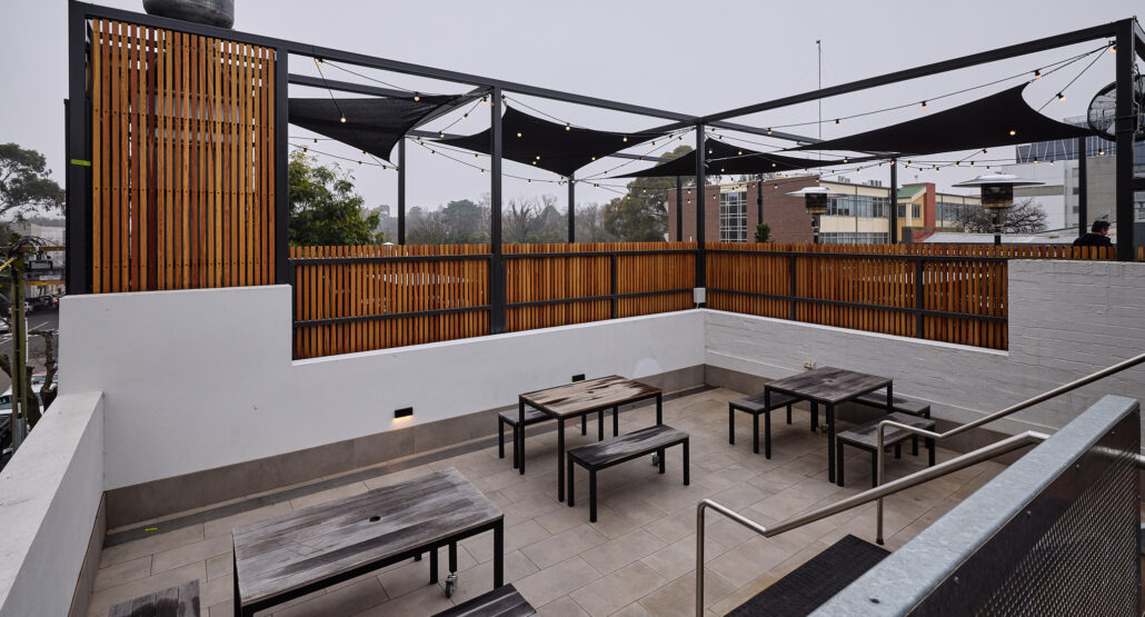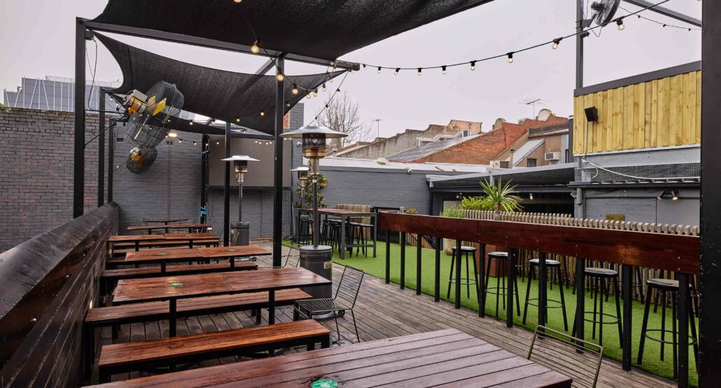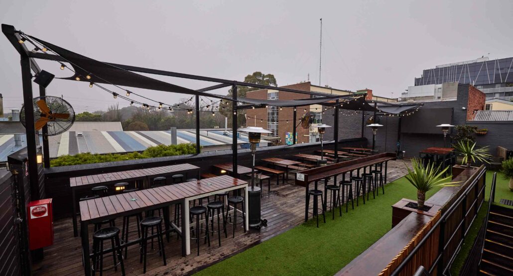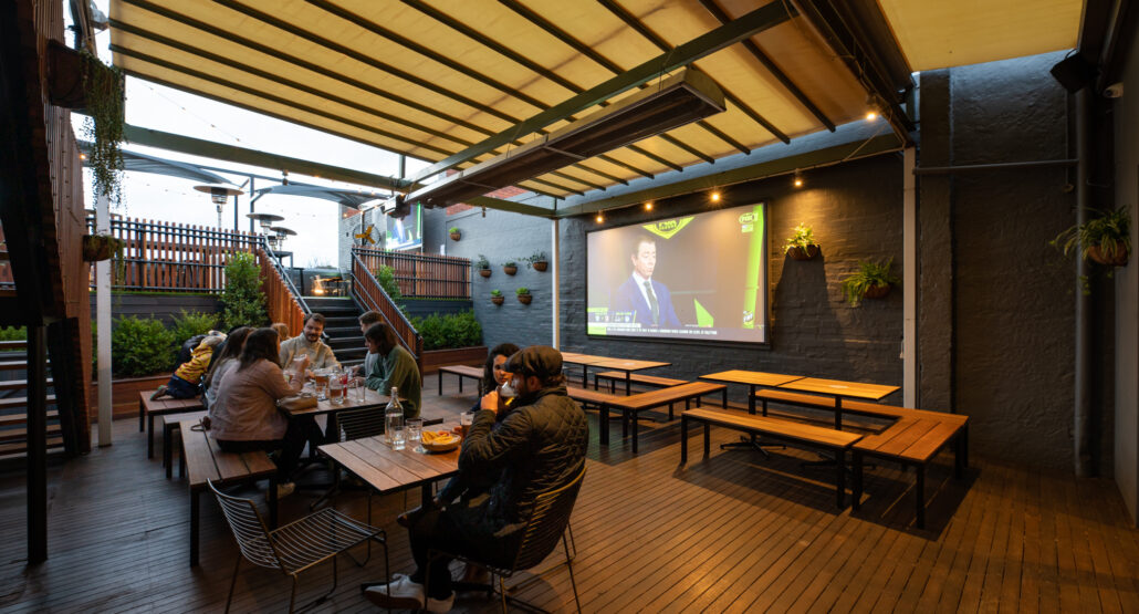 The Lower Deck at Hawthorn Hotel is ideal for watching the AFL, featuring a retractable cover. It seats 40 guests or accommodates 80 standing, providing a comfortable and versatile outdoor space.