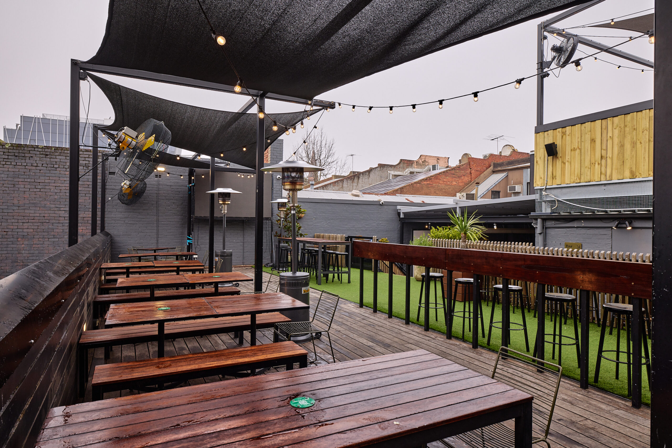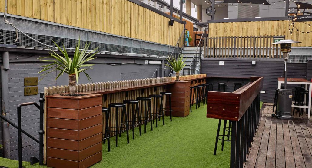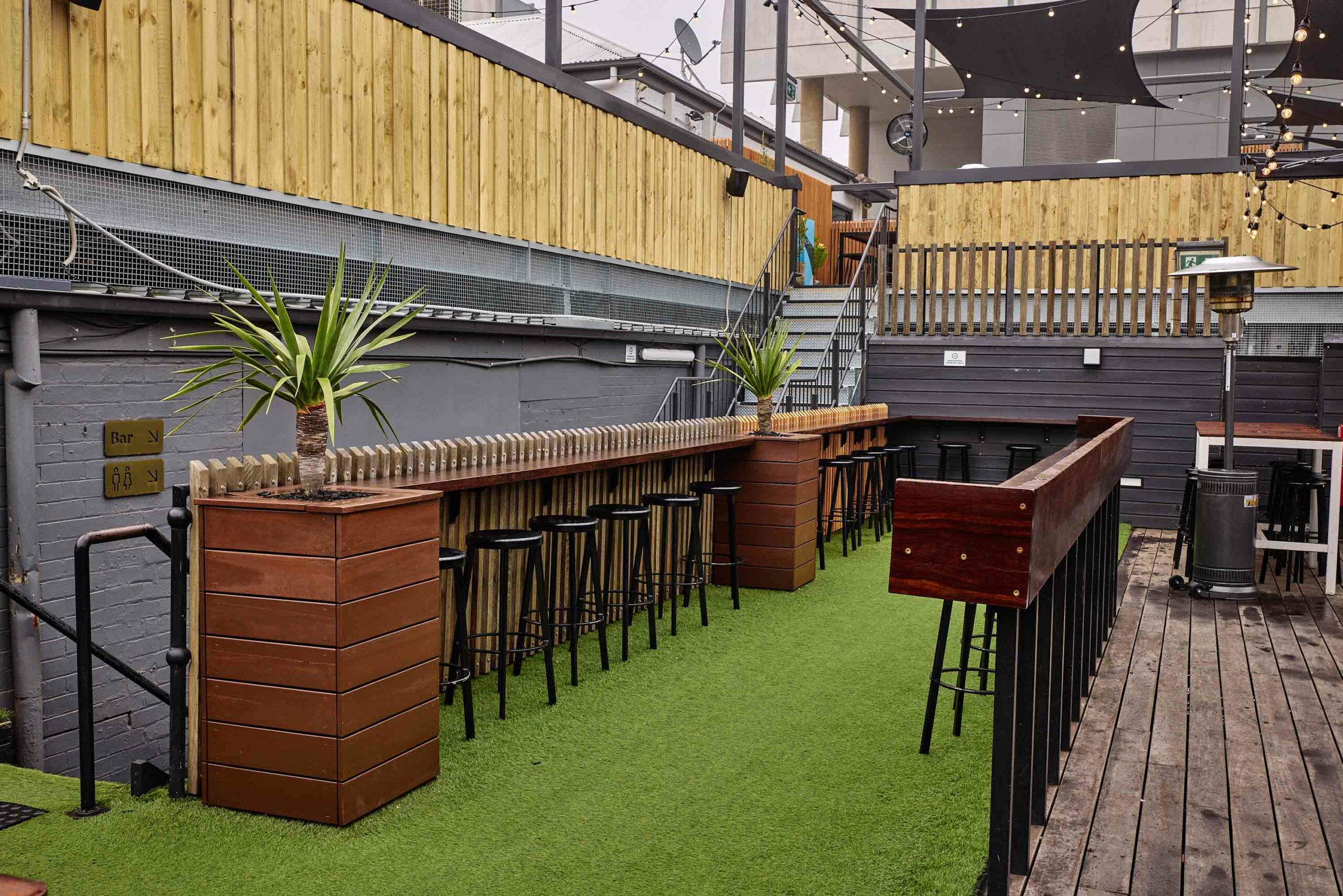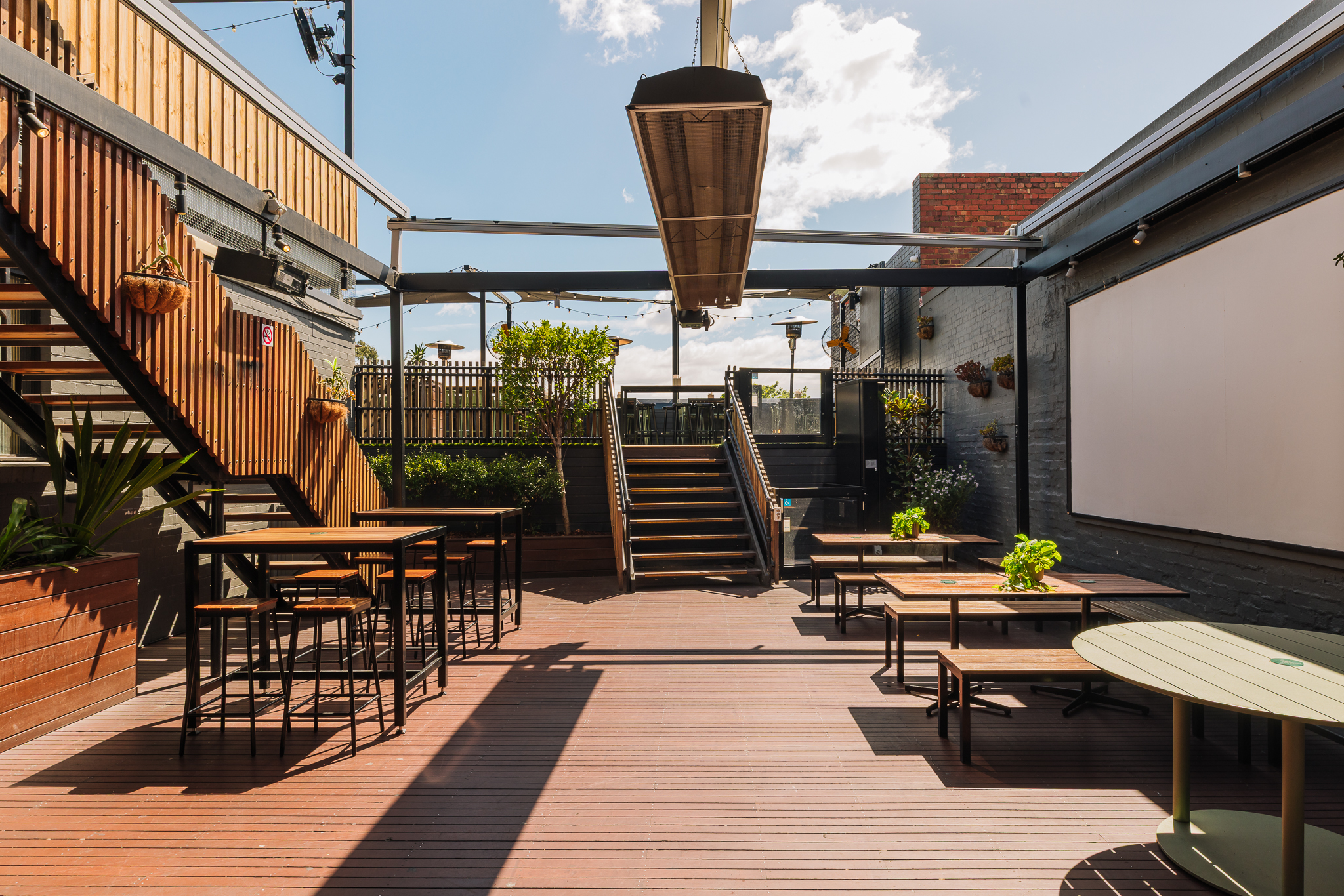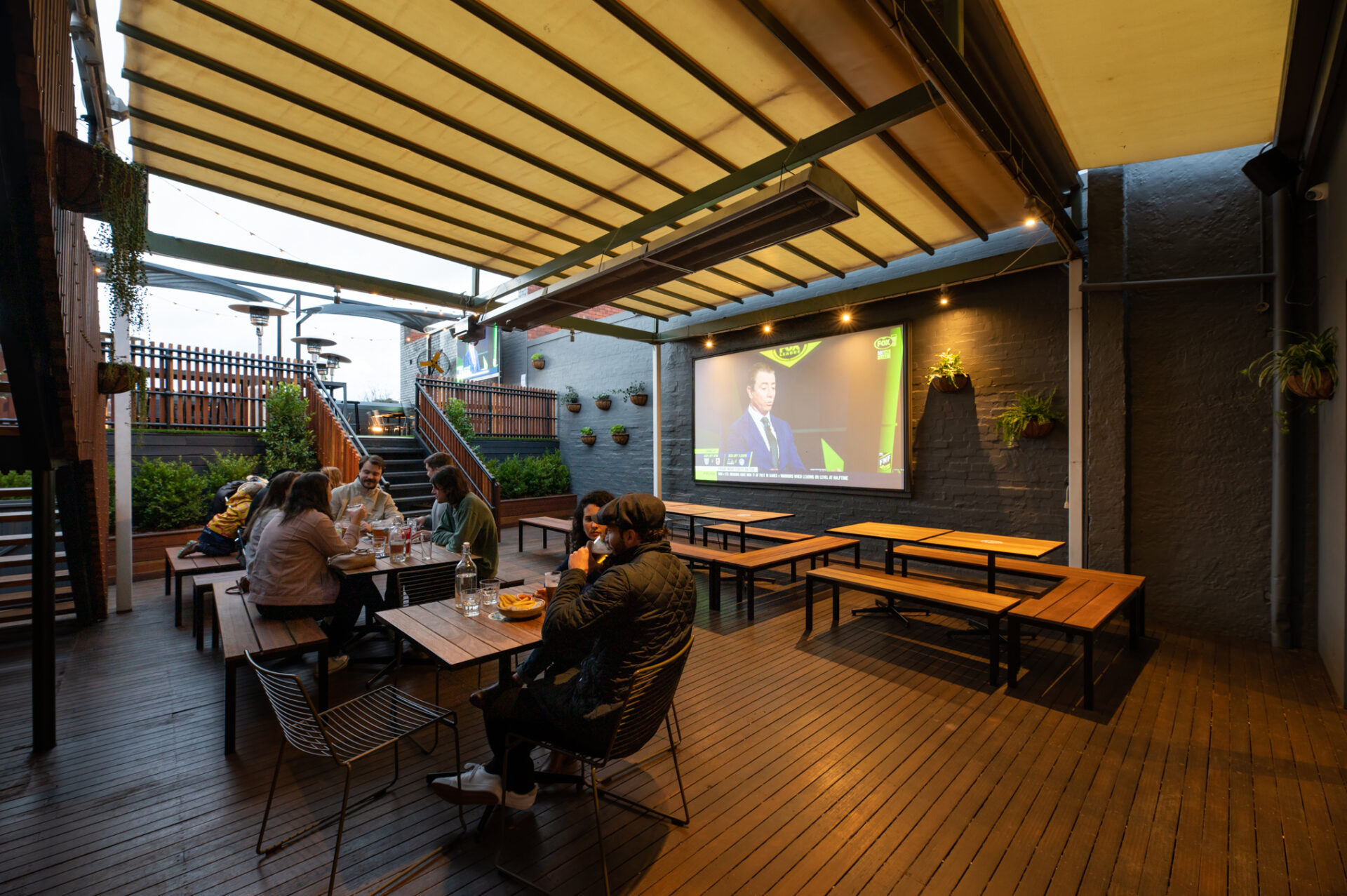 The Lower Deck at Hawthorn Hotel is ideal for watching the AFL, featuring a retractable cover. It seats 40 guests or accommodates 80 standing, providing a comfortable and versatile outdoor space.
