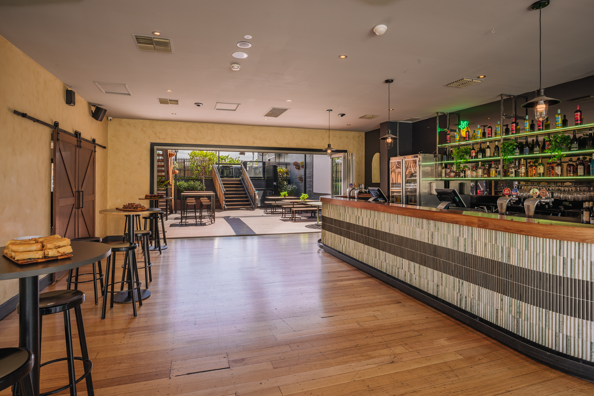 This comfortable and versatile space features our indoor function room with private bar and large deck, with retractable cover, comfortable seating and lush greenery – perfect for any occasion.